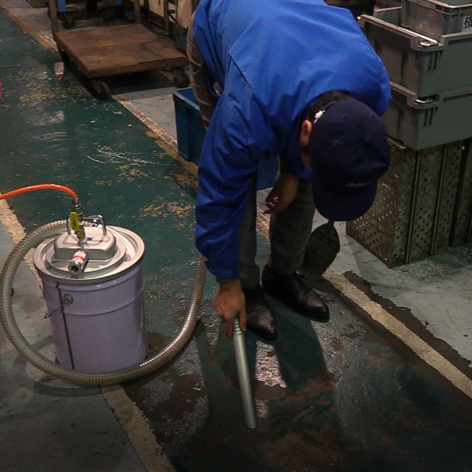 200Lドラム缶用掃除機が、廃液回収に現場で大活躍!