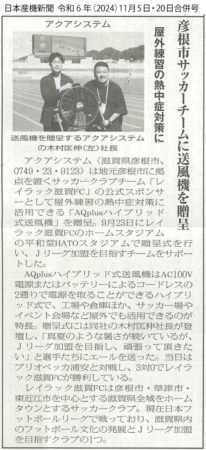 「ハイブリッド式送風機贈呈 アクアシステム 地元サッカークラブ支援」という記事で自社ブランドAQpluから発売しています計量コンパクトかつ持ち運び可能な「ハイブリッド送風機 AQR-18HBシリーズ」を彦根市を拠点にするサッカークラブチーム「レイラック滋賀FC」の公式スポンサーとして屋外練習での熱中症対策に活用していただけるように贈呈を行いました。そちらの贈呈式の様子を記事にして頂きました。