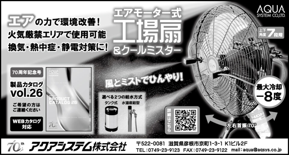 「エアの力で環境改善!エアモーター式工場扇&クールミスター」という広告で、弊社の工場扇をご紹介いただいております。