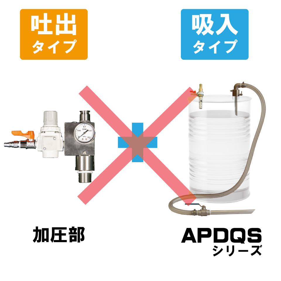 APDQSシリーズ(吸入タイプ)では、吸入パイプの長さが短いため、加圧ユニットを取り付けても液体に届かず吐出できません。
