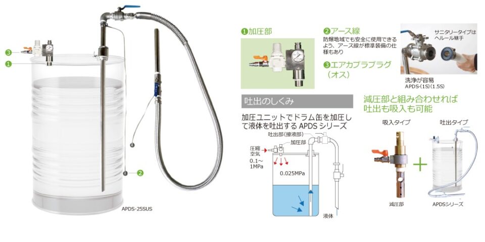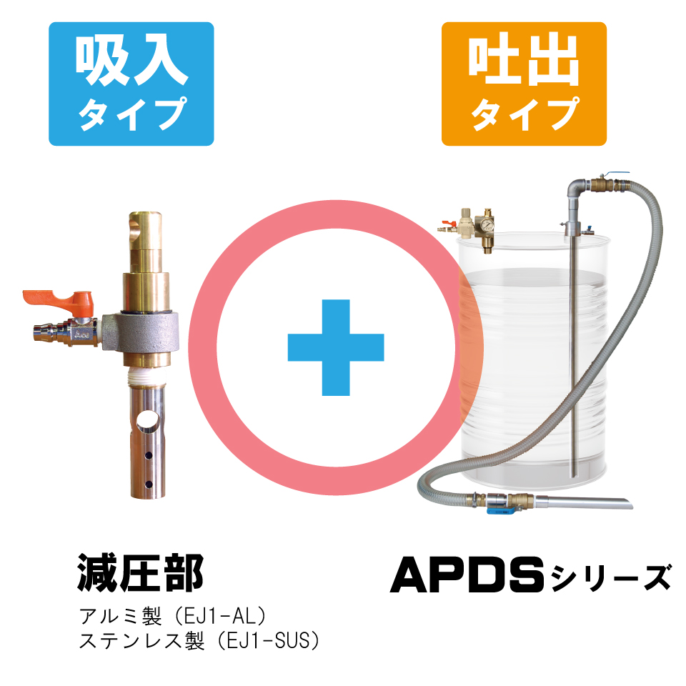 APDSシリーズ(吐出タイプ)と減圧部を購入されますと、減圧部・加圧部のユニット交換で、吐出・吸入のどちらも使用可能です。