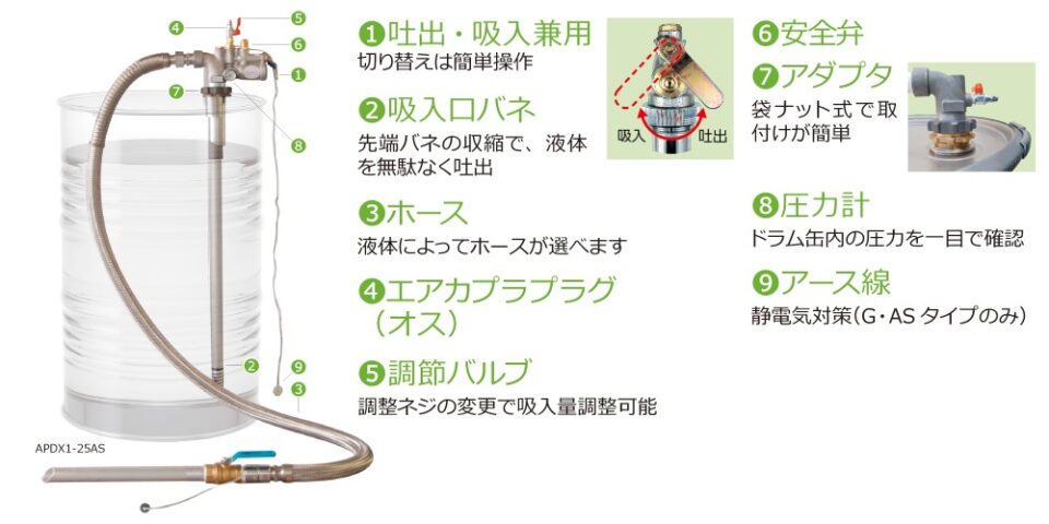 クローズドラム缶に液体を回収・吐出ができるポンプです。 回収はAPDQシリーズの機構を採用し、吐出はAPDシリーズの機構を採用しています。 切り替えはレバー一つで簡単操作できます。工作機械の切削油の入れ替え等に最適です。吐出のしくみ