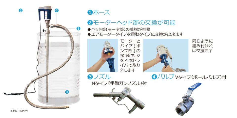 ※モーターヘッド部のエア式や電動式タイプへのそれぞれ交換はCHDはCHDシリーズ同士、CHD1はCHD1シリーズ同士間の交換は可能です。