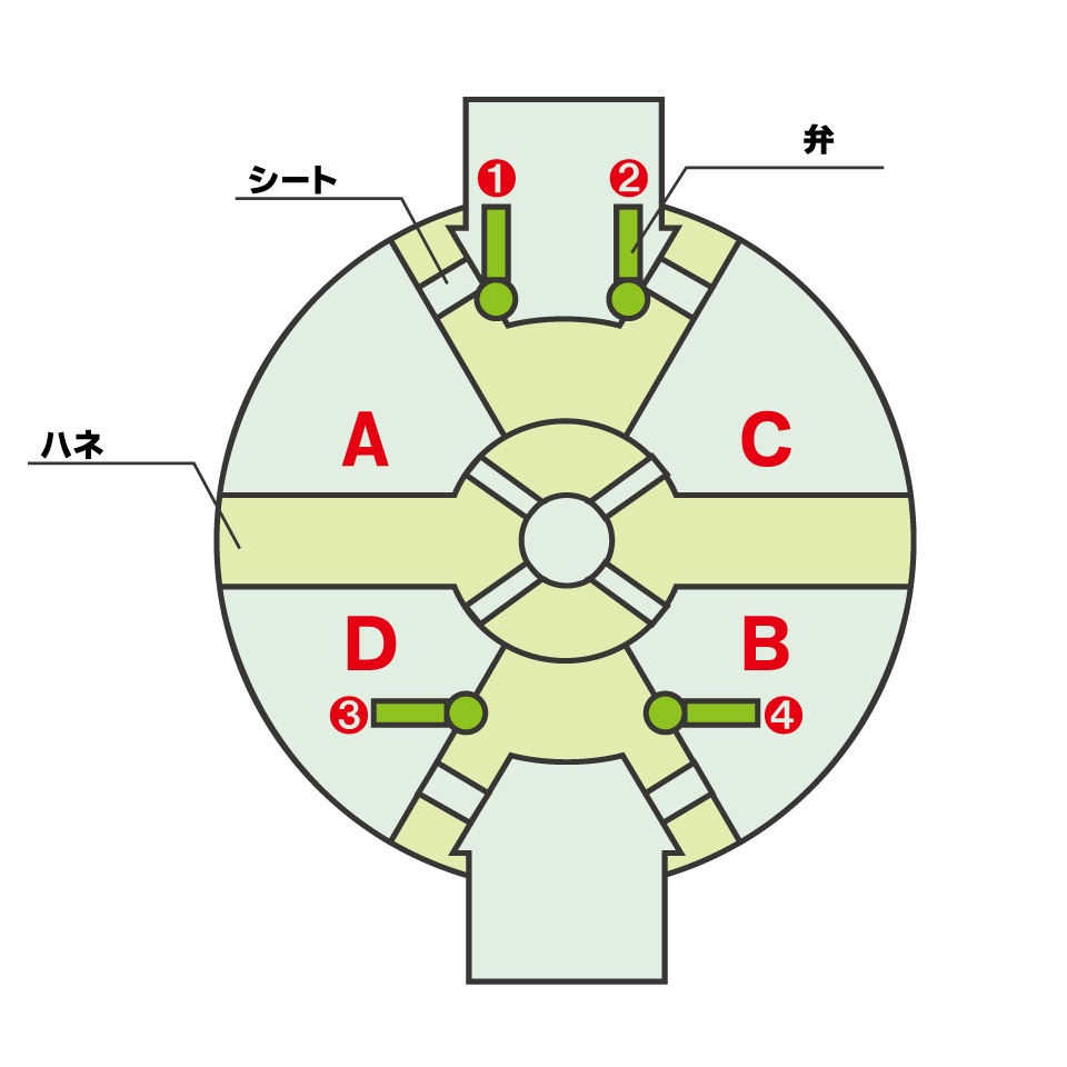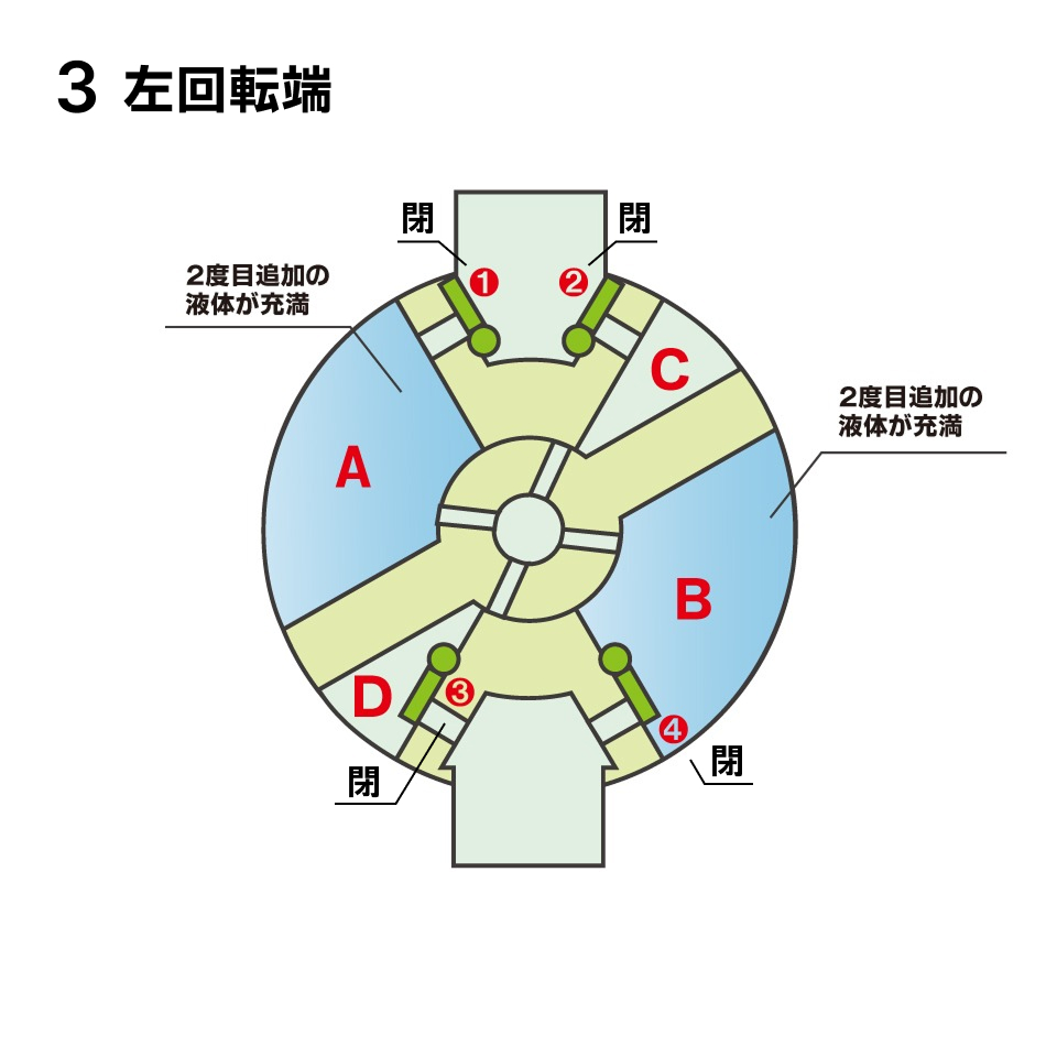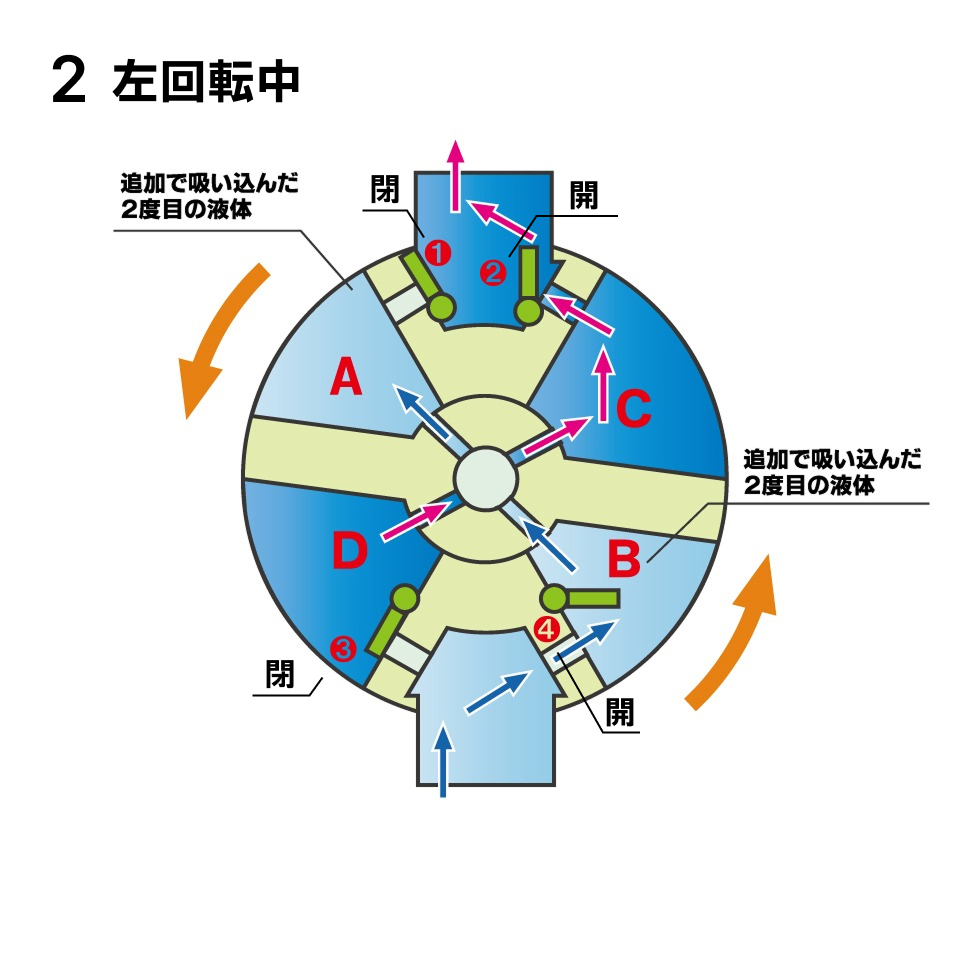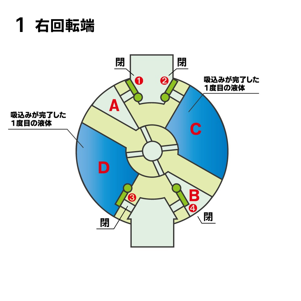 ウイングの左回転によりA、Bは負圧となり弁④より液体を吸い込みます。C、Dの液体はウイングの動きにともない弁②から吐出されます。
