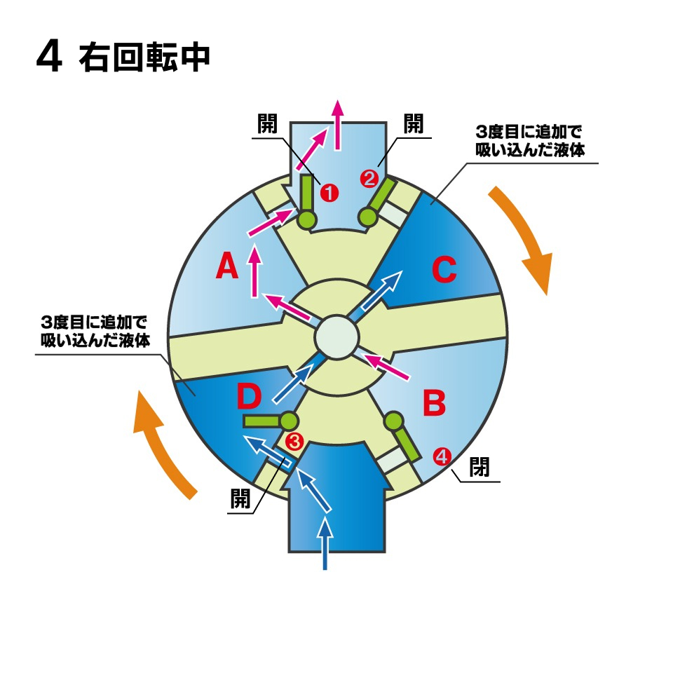 ウイングポンプの右回転によりC、Dは負圧となり弁③より液体を吸い込みます。A、Bの液体はウイングの動きにともない弁①から吐出されます。