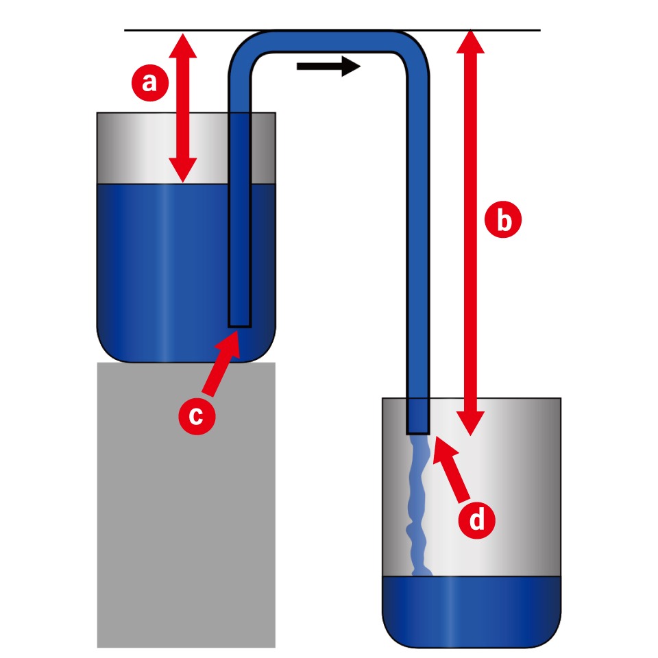 ※また始動時ホース内に空気がありd.が接液しているときは、サイフォンの機能が働きません。一度吐出口を液面から離してホース内に液体を満たして下さい。