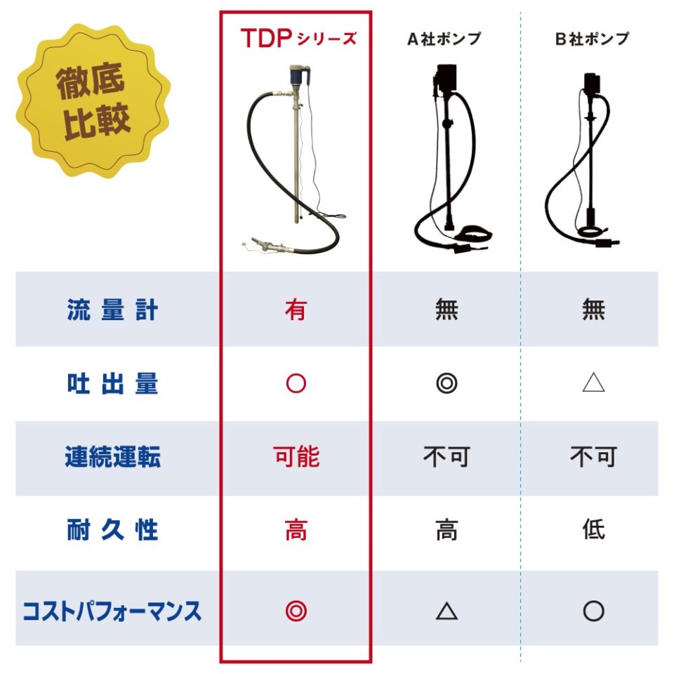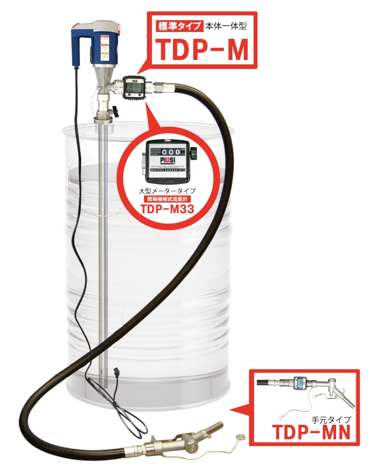 「流量計一体型 電動式ドラムポンプ(TDP-M/TDP-M33/TDP-MN/TDP)」については生産終了に伴い、代理店・販売店での在庫対応のみとなります。