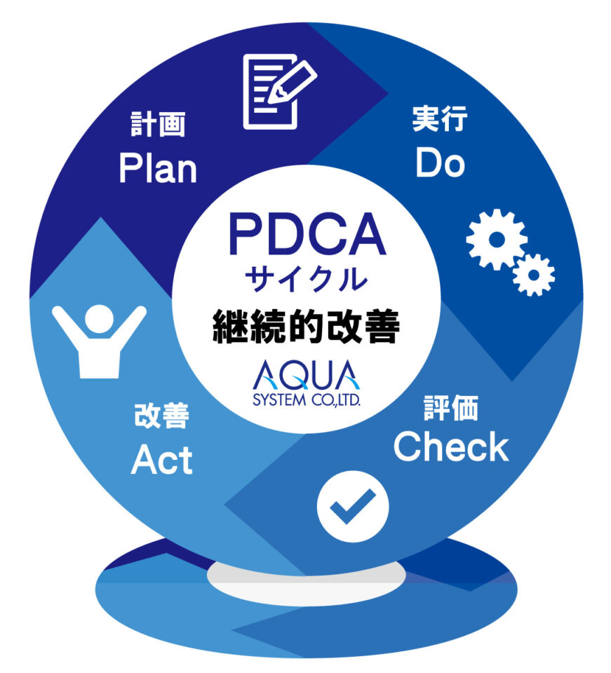 ISO 9001を取得している当社では、PDCAサイクルに基づいた製品やサービスの提供を行う仕組みを作り、実施していきます。 PDCAサイクルというのは、計画(Plan)・実行(Do)・評価(Check)・改善(Act)の英語の頭文字をとったものです。 PDCAのポイントは、計画から改善までをセットとして考え、汎用的な品質管理(Quality Control)の手法を示していることにあります。