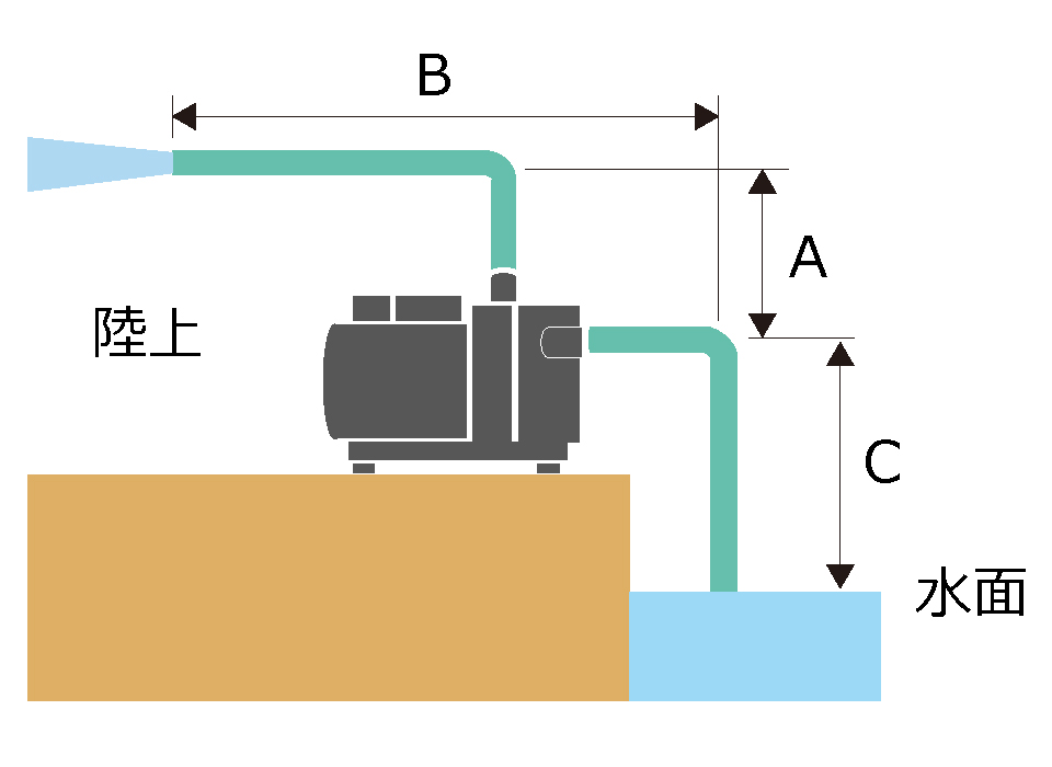 全揚程(m):水面から吐出ホース又は、パイプ先端までの高さ