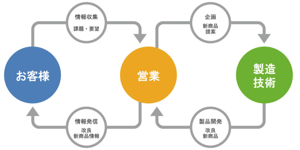 当社では、お客様に製品を安心してご利用頂く為に販売担当スタッフが納品後のフォローまで対応しています。多くのメーカーでは「コールセンターでまとめて対応」というのが一般的ですが、お客様の購入目的や使用状況を把握していないスタッフでは、的確に対応できない部分がどうしても出てきてしまうもの。お客様の購入目的や使用状況を熟知したスタッフがお話をうかがうことで、ご要望に応じた部分的なパーツ交換や仕様の変更などに柔軟かつ迅速に対応をしております。