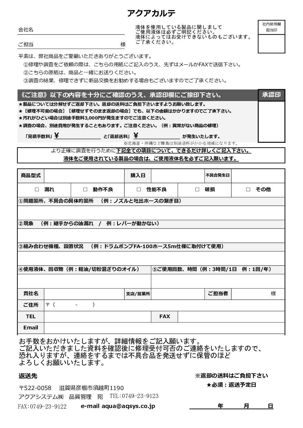 修理が出来ない場合や見積後修理せずに返却の場合でも費用が発生することがございますので、当社でアクアカルテを確認するまで現品送付はお待ちください。詳しくはアクアカルテをダウンロードして注意点をご確認ください。